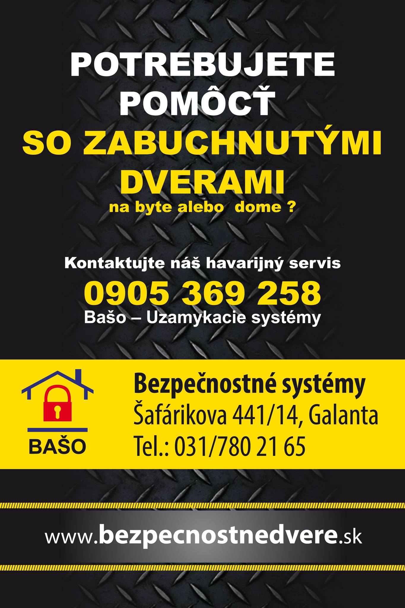 Daniel Bašo - Bezpečnostné uzamykacie systémy so sídlom v Galante je rodinná firma, ktorá sa už od roku 1992 špecializuje na predaj a montáž aj servis mechanických zabezpečovacích systémov a bezpečnostných . V našej ponuke nájdete všetko od kvalitných dverí rôznych kategórií, cez trezory a sejfy, kovania až po uzamykacie systémy a široký sortiment príslušenstva.