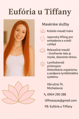 Spoločnosť Eufória u Tiffany so sídlom v meste Michalovce je moderné centrum zamerané na starostlivosť o krásu, zdravie a duševnú pohodu. Jej filozofia stojí na myšlienke, že harmónia tela a mysle je základom kvalitného a spokojného života. Prostredníctvom špecializovaných masáží a procedúr sa snaží prinášať klientom nielen viditeľné estetické výsledky, ale aj hlboký pocit oddychu a regenerácie. Príjemné prostredie, individuálny prístup a profesionálne služby robia zo spoločnosti miesto, kde sa každý klient môže naplno uvoľniť a načerpať novú energiu.